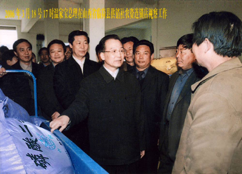 2006年3月18日,中共中面政治局常委、國(guó)務(wù)院總理溫家寶在安徽省委書記(時(shí)任山西省委書記)張寶順(左二)等陪同下,前往山西省臨猗縣z6mg人生就是博化肥經(jīng)銷點(diǎn)視察工作。